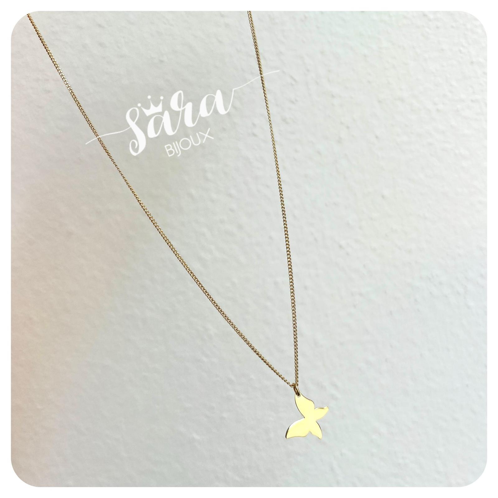 Collana girocollo (misura 40 cm + 3 cm di prolunga circa) catena micro-groumette con pendente farfalla (misure 10 x 12 mm circa) in argento 925 anallergico placcato oro giallo.