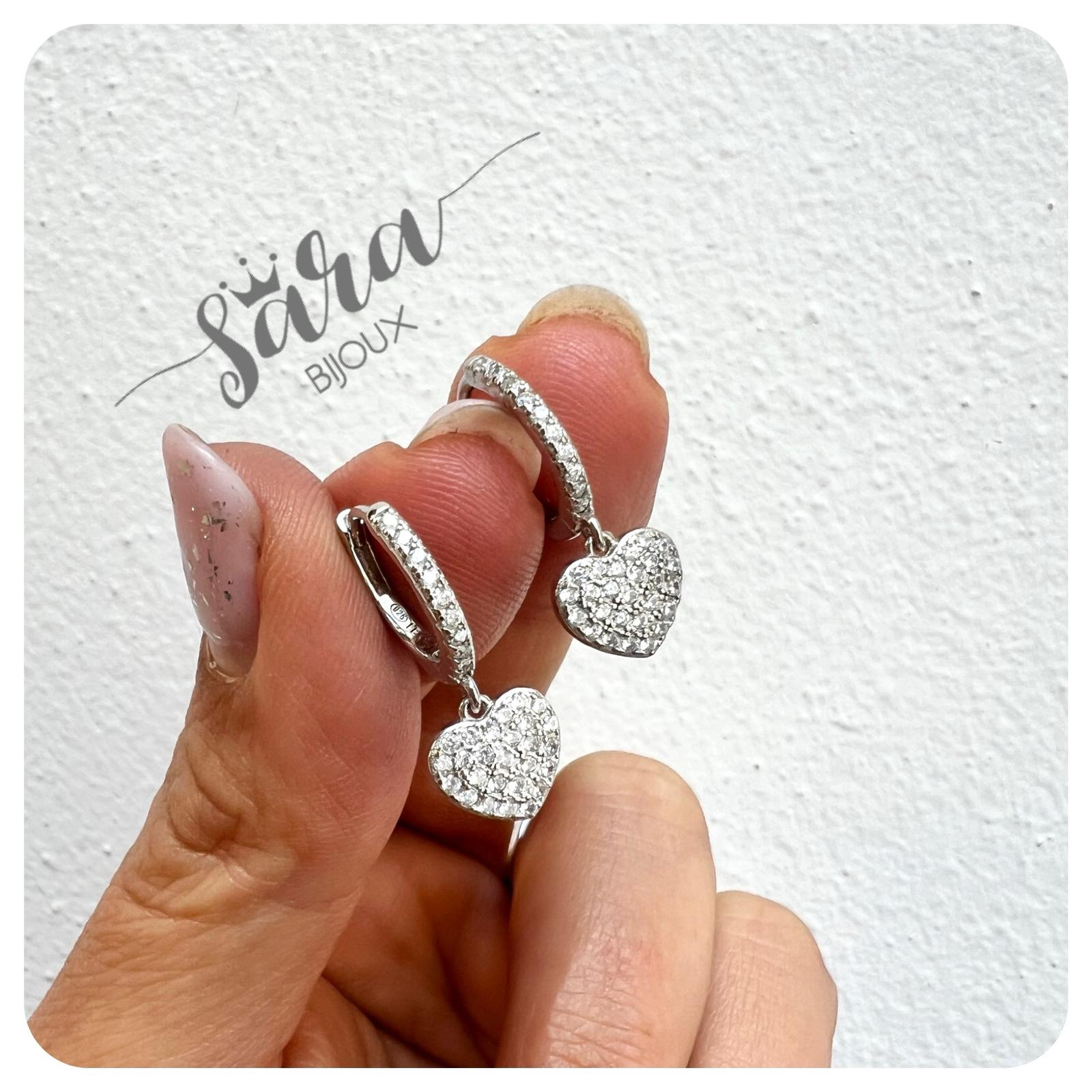Orecchino cerchio (diametro 1 cm circa) con cuoricino pendenti di zirconi bianchi in argento 925 anallergico rodiato (chiusura scattino).